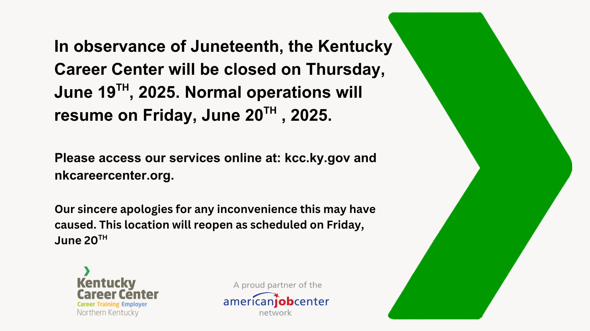 KCC Holiday Closings Thursday, June 19, 2025 8:00 AM 11:59 PM Google Calendar ICS In observance of Juneteenth, the Kentucky Career Center will be closed on Thursday, June 19TH, 2025. Normal operations will resume on Friday, June 20TH , 2025.